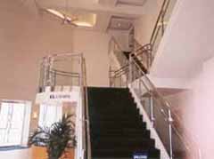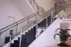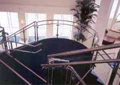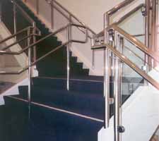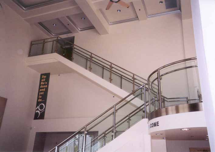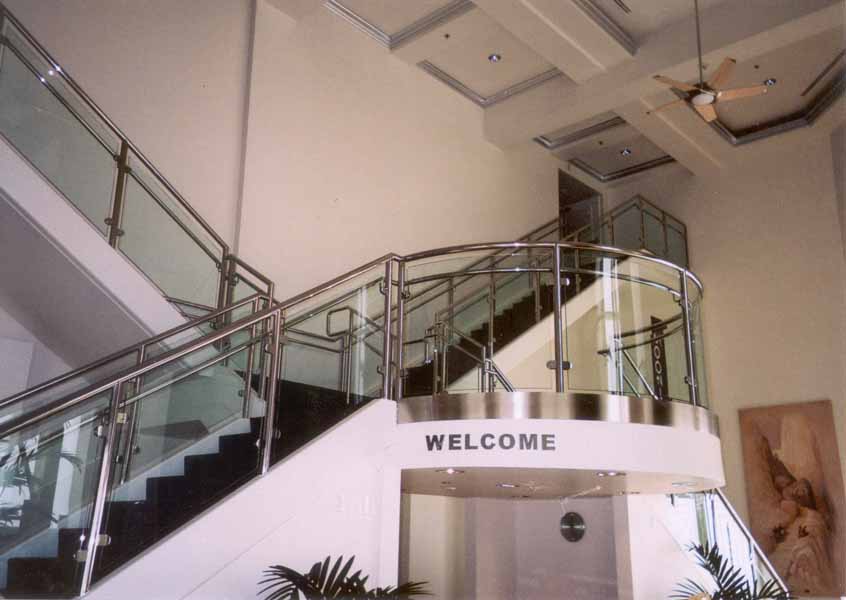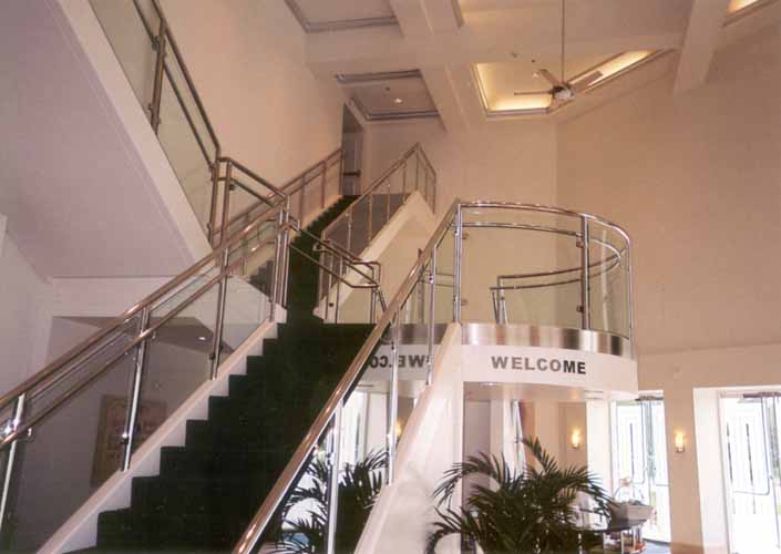 ABS Connection, Inc. San Joaquin, CA 93660 Tel: 559-899-9925 "Church" Stainless Steel hand and guard rails, with glass panels! Very attractive! Click on images for larger view
